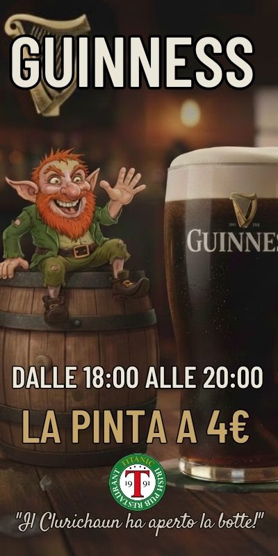 Ogni giorno FINO AL 31 Luglio , lo spirito della cantina apre i rubinetti: hai due ore esatte per goderti la Regina delle Stout al prezzo più basso della città. Ma attento... chiudi il conto prima delle 20:00, dopo Clurichaun torna a fare i conti e la magia svanisce!